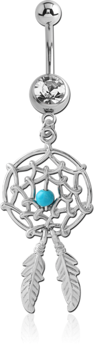 SURGICAL STEEL GRADE 316L JEWELED NAVEL BANANA WITH SILVER PLATED DREAMCATCHER FEATHERS CHARM