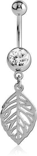 SURGICAL STEEL GRADE 316L JEWELED NAVEL BANANA WITH DANGLING SILVER PLATED CHARM - LEAF