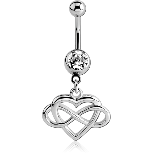 RHODIUM PLATED BASE METAL JEWELED NAVEL BANANA - ENTANGLED HEART AND INFINITY