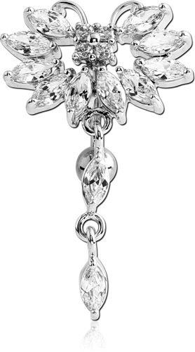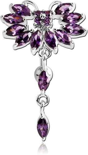 RHODIUM PLATED BASE METAL JEWELED BUTTERFLY REVERSE NAVEL BANANA WITH DANGLING CHARM - PEAR