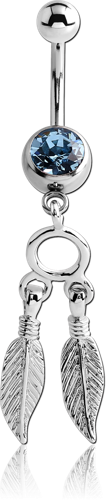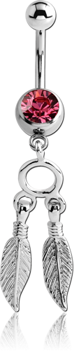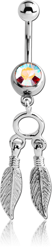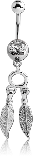 SURGICAL STEEL GRADE 316L JEWELED NAVEL BANANA WITH DANGLING CHARM - FEATHER