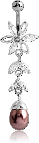 RHODIUM PLATED BASE METAL JEWELED FLOWER NAVEL BANANA WITH DANGLING CHARM - ORGANIC SYNTHETIC PEARL