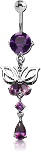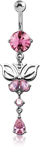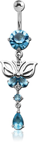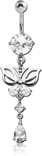 RHODIUM PLATED BASE METAL JEWELED NAVEL BANANA WITH DANGLING CHARM - BUTTERFLY