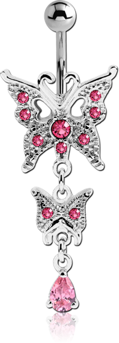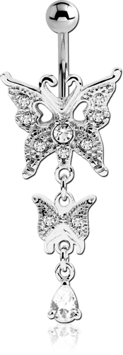 RHODIUM PLATED BASE METAL JEWELED NAVEL BANANA WITH DANGLING CHARM - BUTTERFLY