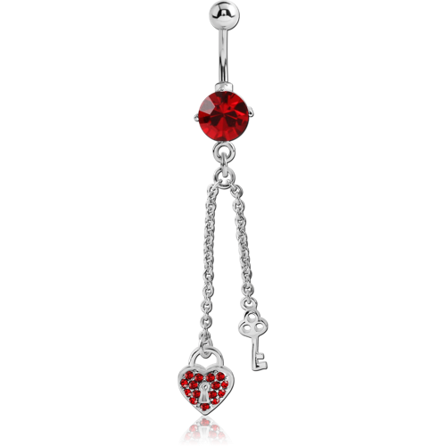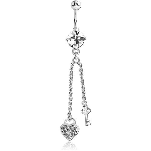 RHODIUM PLATED BASE METAL JEWELED NAVEL BANANA WITH DANGLING CHARM - HEART LOCK KEY