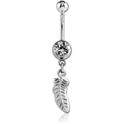 RHODIUM PLATED BASE METAL JEWELED NAVEL BANANA WITH DANGLING CHARM - FEATHER
