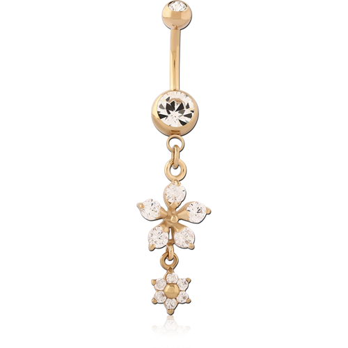 GOLD PVD COATED SURGICAL STEEL GRADE 316L DOUBLE ROUND CZ JEWELED WITH DANGLING NAVEL BANANA