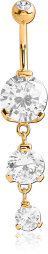 GOLD PVD COATED SURGICAL STEEL GRADE 316L TRIPLE ROUND CZ DOUBLE PREMIUM CRYSTAL JEWELED DANGLE NAVEL BANANA