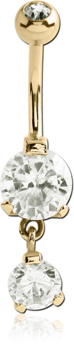 ZIRCON GOLD PVD COATED SURGICAL STEEL GRADE 316L DOUBLE ROUND CZ DANGLE BANANA WITH JEWELED BALL