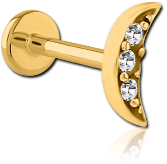 STERILE GOLD PVD COATED SURGICAL STEEL GRADE 316L INTERNALLY THREADED JEWELED MICRO LABRET - CRESCENT 3 GEMS