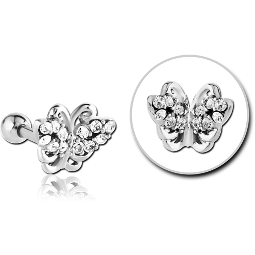 SURGICAL STEEL GRADE 316L JEWELED TRAGUS MICRO BARBELL - BUTTERFLY