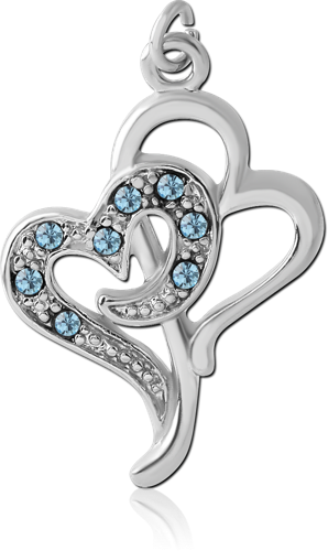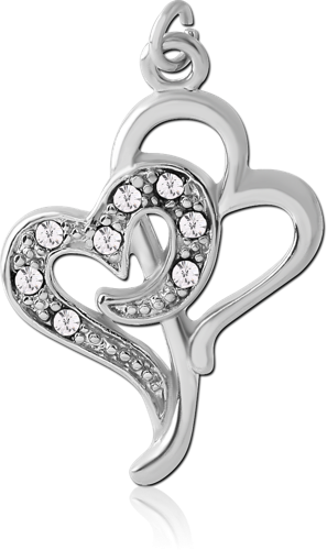 RHODIUM PLATED BASE METAL JEWELED DOUBLE HEART CHARM
