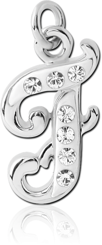 RHODIUM PLATED BASE METAL CRYSTALINE SCRIPT LETTER CHARM - F
