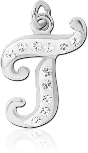 RHODIUM PLATED BASE METAL CRYSTALINE SCRIPT LETTER CHARM - T