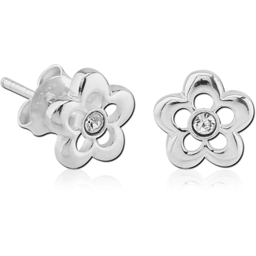 STERLING 925 SILVER FLOWER EAR STUDS WITH JEWEL - PAIR