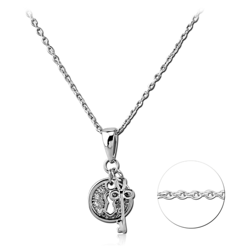 RHODIUM PLATED STERLING 925 SILVER JEWELED NECKLACE WITH PENDANT - ROUND LOCK WITH KEY
